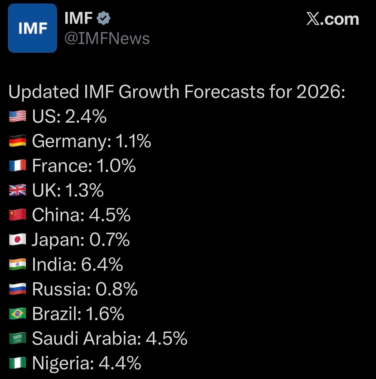 Money Matters Monitoring – A widely shared tweet highlights India’s economy dropping to sixth place in the latest IMF projections for 2026 nominal GDP, with the United States leading at ~$32.38 trillion, followed by China (~$20.85 trillion), Germany (~$5.45 trillion), Japan (~$4.38 trillion), the UK (~$4.26 trillion), and India (~$4.15 trillion), pushing France to seventh (~$3.6 trillion). The tweet, posted by @stats_feed, states: “India economy slips to 6th place in the latest IMF report for 2026 : 1. 🇺🇸 United States ~ $32.38 trillion 2. 🇨🇳 China ~ $20.85 trillion 3. 🇩🇪 Germany ~ $5.45 trillion 4. 🇯🇵 Japan ~ $4.38 trillion 5. 🇬🇧 United Kingdom ~ $4.26 trillion 6. 🇮🇳 India ~ $4.15 trillion 7. 🇫🇷 France ~ $3.6 trillion 8. 🇮🇹 Italy ~ $2.74 trillion 9. 🇷🇺 Russia ~ $2.66 trillion 10. 🇧🇷 Brazil ~ $2.64 trillion”