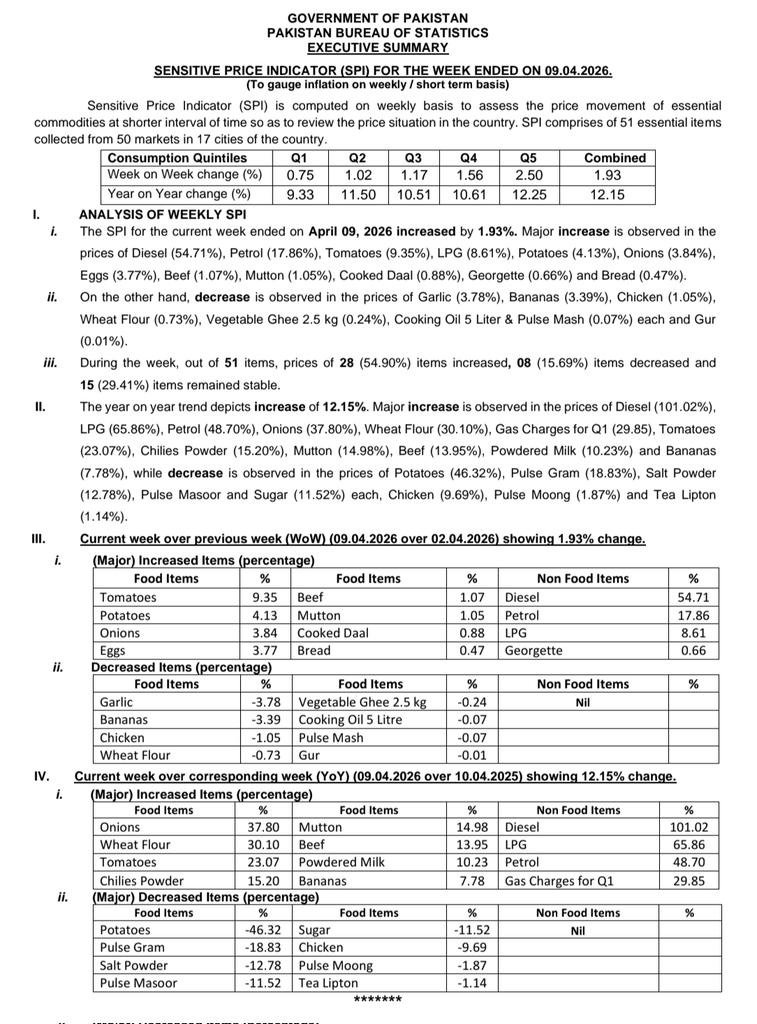 1. Sharpest weekly SPI rise in two years: Pakistan’s Sensitive Price Indicator jumped 1.93% week-on-week for the period ending April 9, 2026, with fuel prices, particularly diesel at 54.71%, acting as the primary driver.