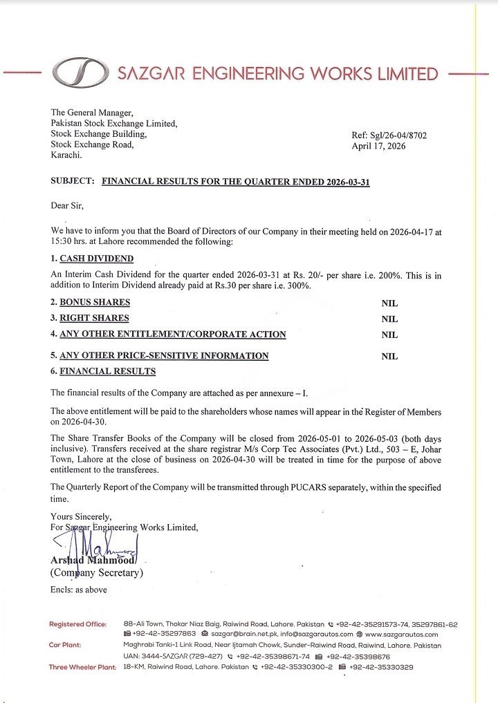 Karachi, Pakistan – Sazgar Engineering Works Limited (SAZE) continues to outpace the broader automotive sector, reporting a robust financial performance for the nine-month period ending March 2026. The company announced a 200% interim cash dividend (Rs 20 per share), which comes on the heels of earlier payouts, bringing the cumulative dividend for the fiscal year to 500%.