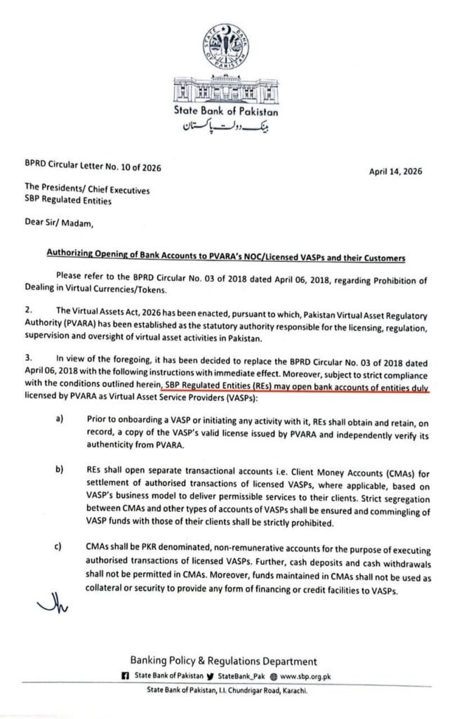 - State Bank of Pakistan’s BPRD Circular No. 10 of 2026 replaces the 2018 ban, allowing banks to open accounts for PVARA-licensed crypto firms under strict AML rules.