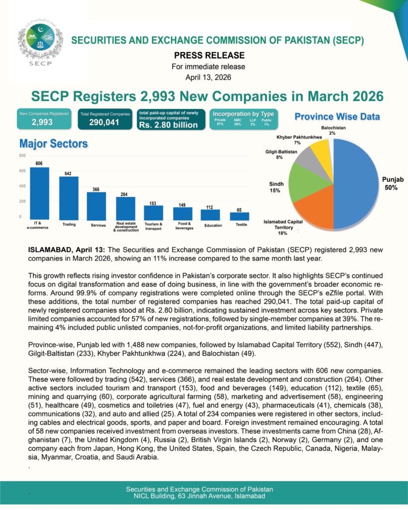 Islamabad, Pakistan – The Securities and Exchange Commission of Pakistan (SECP) announced a robust rise in business formations, with 2,993 new companies registered in March 2026 – an 11% increase from March last year. This growth underscores rising investor trust and the positive impact of government-led economic reforms on Pakistan’s corporate landscape.