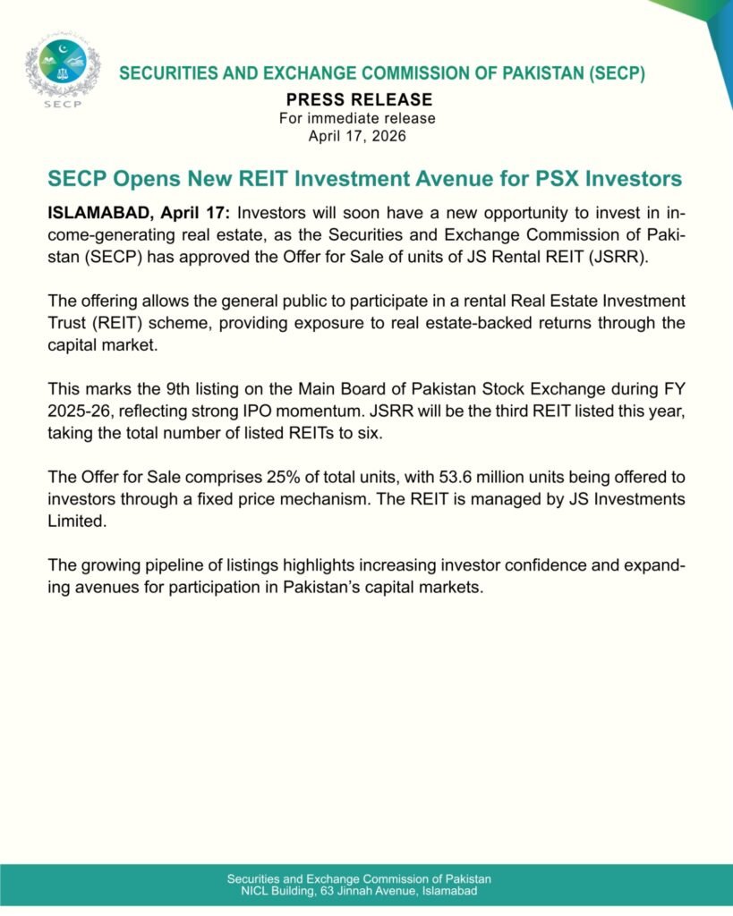 Islamabad, Pakistan – The Securities and Exchange Commission of Pakistan (SECP) has officially approved the Offer for Sale of units for the JS Rental REIT (JSRR), opening a fresh window for the general public to tap into the lucrative rental income market. This strategic move, announced on April 17, 2026, allows retail investors to gain exposure to real estate-backed returns directly through the capital markets.